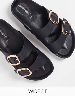 London Rebel wide fit double buckle footbed sandals in black